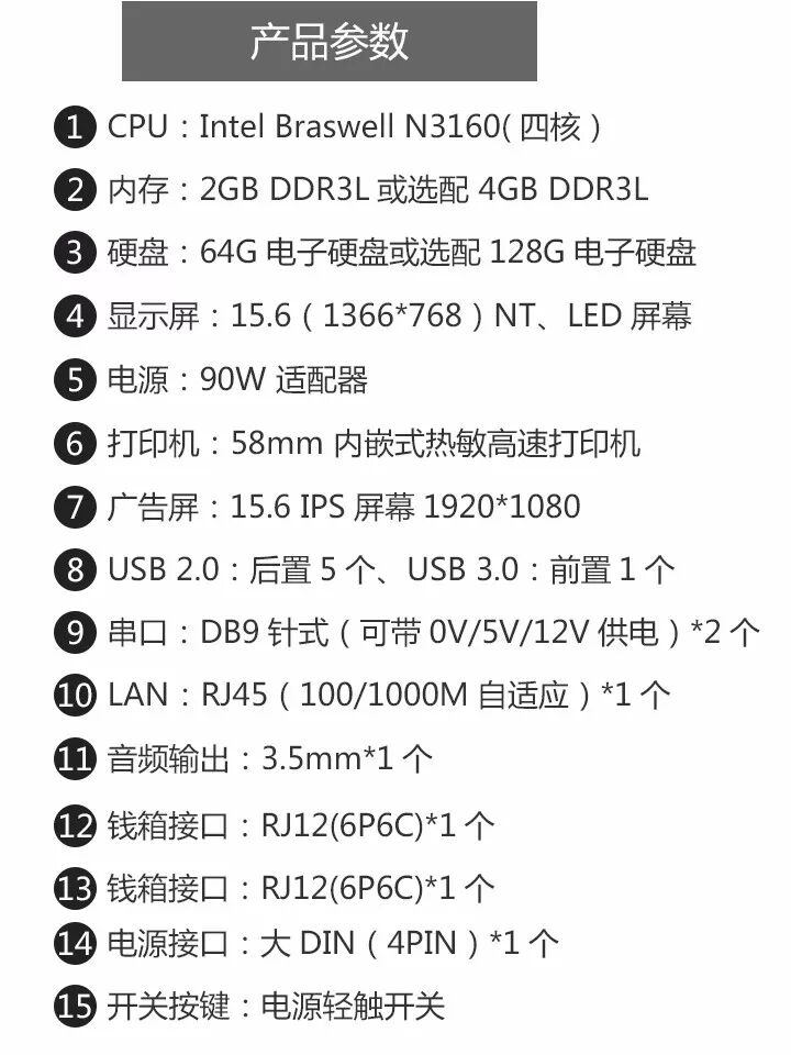 1920*1080 IPS广告屏,支持1080P视频播放、不仅顾客展现丰富多彩的广告内容和资信。还可在播放广告时同步显示收银找零等信息。
