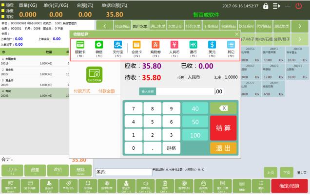 前台支持顾客以现金、银行卡付款外,更支持手机“支付宝”“微信”支付,配合大多数群体的支付习惯,同时也减少您收零,找零的不便,告别假币烦恼,收银也可以如此简单。